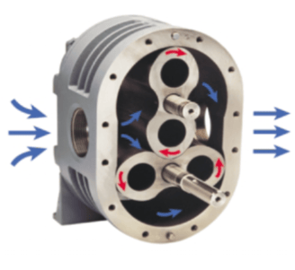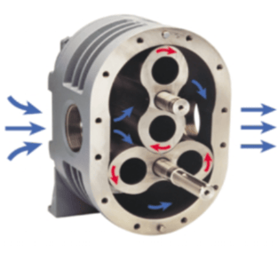 Positive Displacement (Volume Reduction) type of compression. Lobe blowers consist of two rotors spinning in opposite directions. The blower sucks in air, and the lobes spin the air around before pushing the air out.