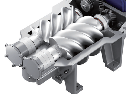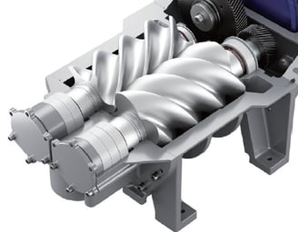 Positive Displacement (Volume Reduction) type of compressor. Using rotary movements to compress the air. Within the compressor, there is a set of male and female rotors. They are designed differently, when turned in unison, air will be trapped between them.